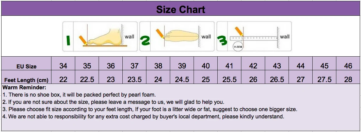 3. Please choose fit size according to your feet length, If your foot is a litter wide or fat, suggest to choose one bigger size.